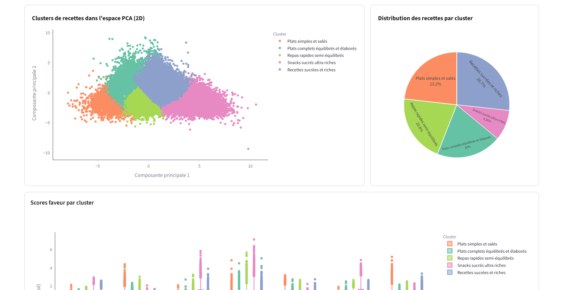 This approach made it possible to highlight distinct recipe profiles, such as lighter or more energy-dense dishes, recipes with shorter preparation times, or clusters shaped by stronger user engagement. The result is a more data-driven way of navigating culinary diversity.