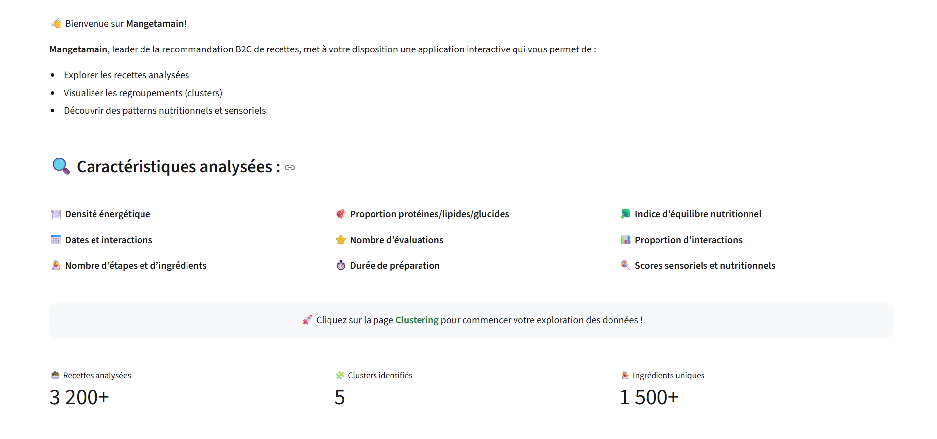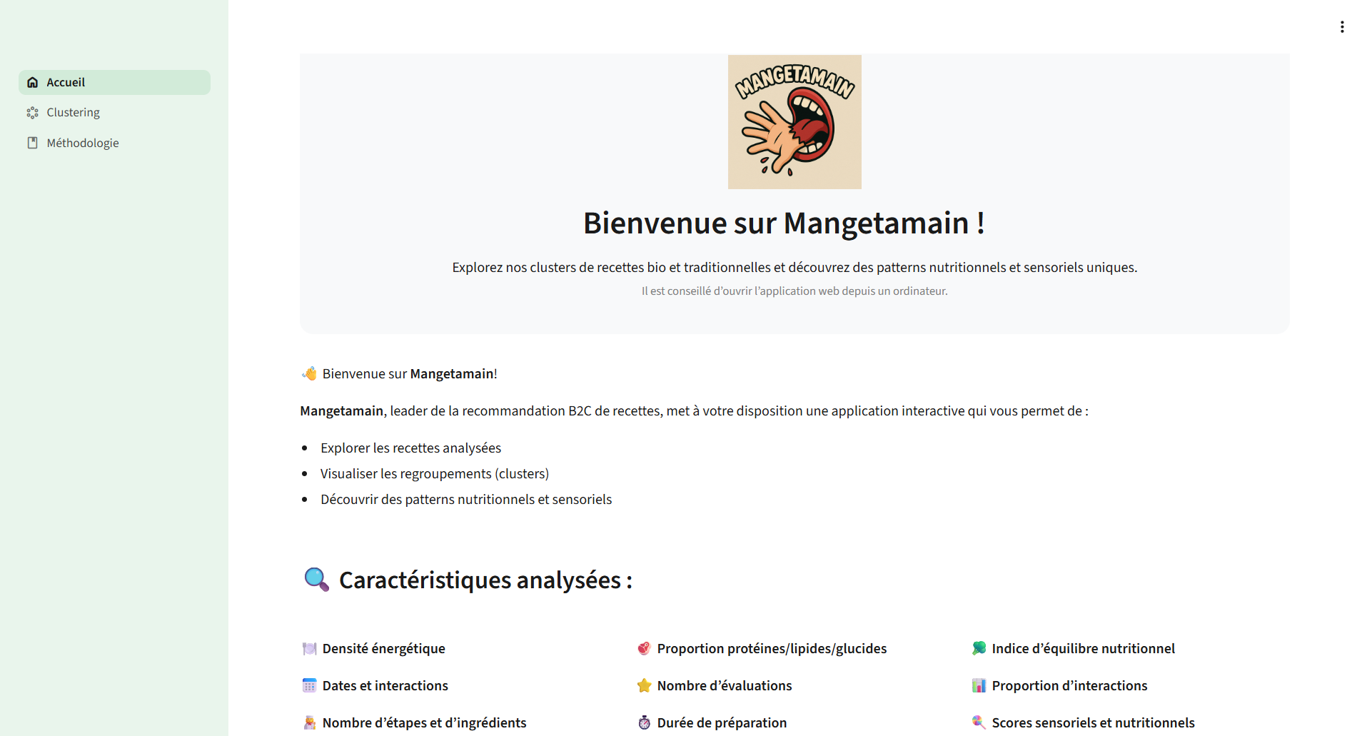 Mangetamain was designed as an interactive platform for exploring large-scale recipe data through a user-friendly web interface. The goal was to go beyond simple recipe browsing and provide a structured way to analyze nutritional composition, sensory patterns, preparation habits, and user interactions.